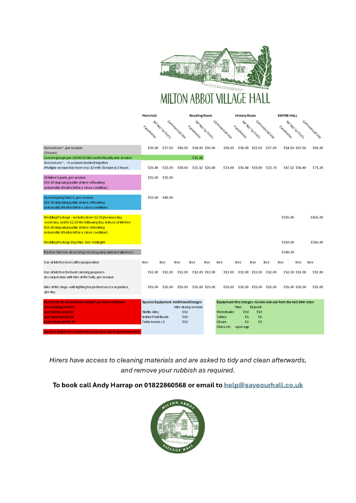 The main hall and toilets remain fully operational. Our kitchen is not operational but a new one is planned for January 2026. Of the two smaller rooms, the History room remains out of bounds awaiting new floors. The Reading room however is available, albeit not looking at its finest. It does have heating and is a great smaller space.